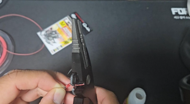 아래 사진처럼 감기가 완료되면 처음 1.5cm 부분을 당겨서 매듭을 완성해 줍니다. 이를 이용해서 당기는 분들이 있는데 상당히 위험하니 꼭 기구를 사용해서 당겨주세요.