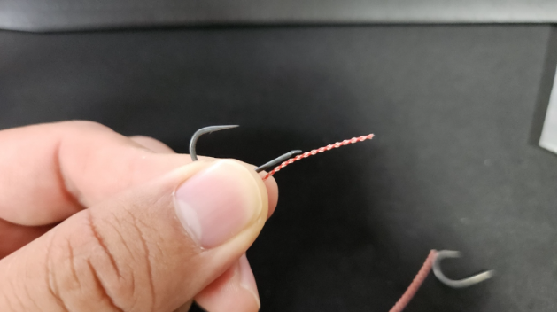 첫 번째 훅이 묶인 반대쪽 라인 끝 바늘등을 대고 둥글게 말아 5~6바퀴 감아줍니다.