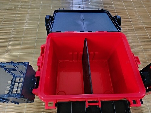 상단 공간 넉넉한 6칸의 공간 분리 구조로 봉돌이나 에기 그리고 도래 등을 보관하기 좋고 분리도 가능해서 소품의 사이즈에 따라서 칸의 수를 조정할수 있는 장점이 있습니다. 재질은 우리가 익히 잘 알고 있는 고급 태클박스에 절때 뒤지지 않습니다.