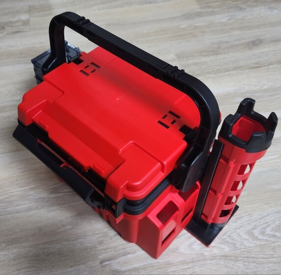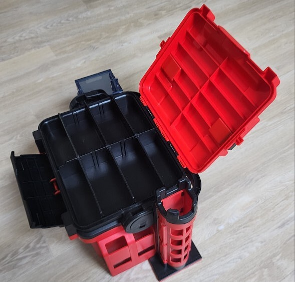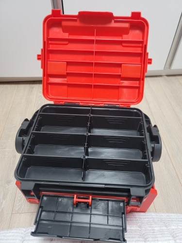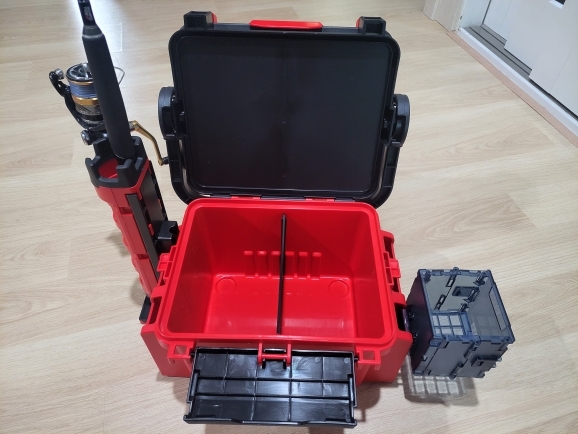 쉽게 조립한 모습인데요 커버를 오픈해도 밸런스가 잘 맞아 굉장히 안정적입니다. 손잡이 고정 시스템도 적용되어 있어 커버가 실수로 열려 안쪽에 있는 내용물이 쏟아지는 상황을 예방 합니다. 요즘 알리 낚시 용품 구경과 구매로 시간을 보내고 있는데 정말 좋은 제품 저렴하게 잘 나온것들이 많이 있습니다.